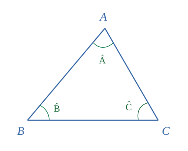 Dans un triangle ordinaire \(ABC\), la somme des angles d'un triangle fait toujours \(180°\) \((\pi \ radians) \).