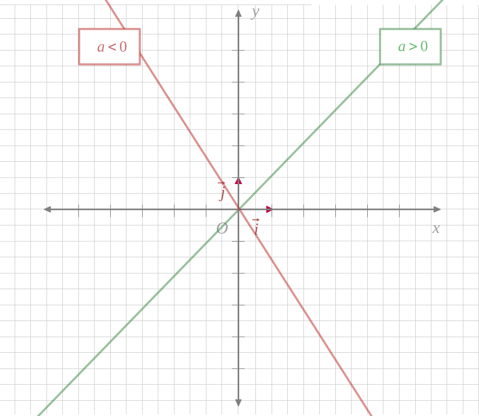 Le nombre \(a\) est appellé le coefficient directeur. C'est le signe de ce coefficient qui indique quelle sera l'inclinaison de la droite.